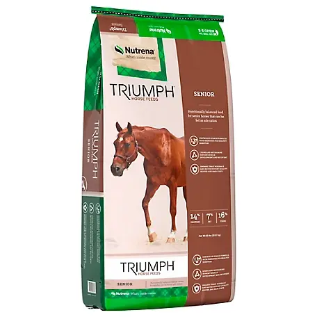 The Nutrena Triumph 14% Senior Horse Feed is designed to feed the aging horses you care for. It features controlled starch for healthy digestion and has all the added fat, vitamins, and minerals they need to live long, healthy lives. It's also made with Lysine and Methionine to support muscle development and recovery. Organic trace minerals and biotin help promote quality hooves and hair coats. It's solid nutrition at a great value. This formula consists of 14% crude protein, 16% max crude fiber, and 7% crude fat. Available in a value sized 50 lb. bag.